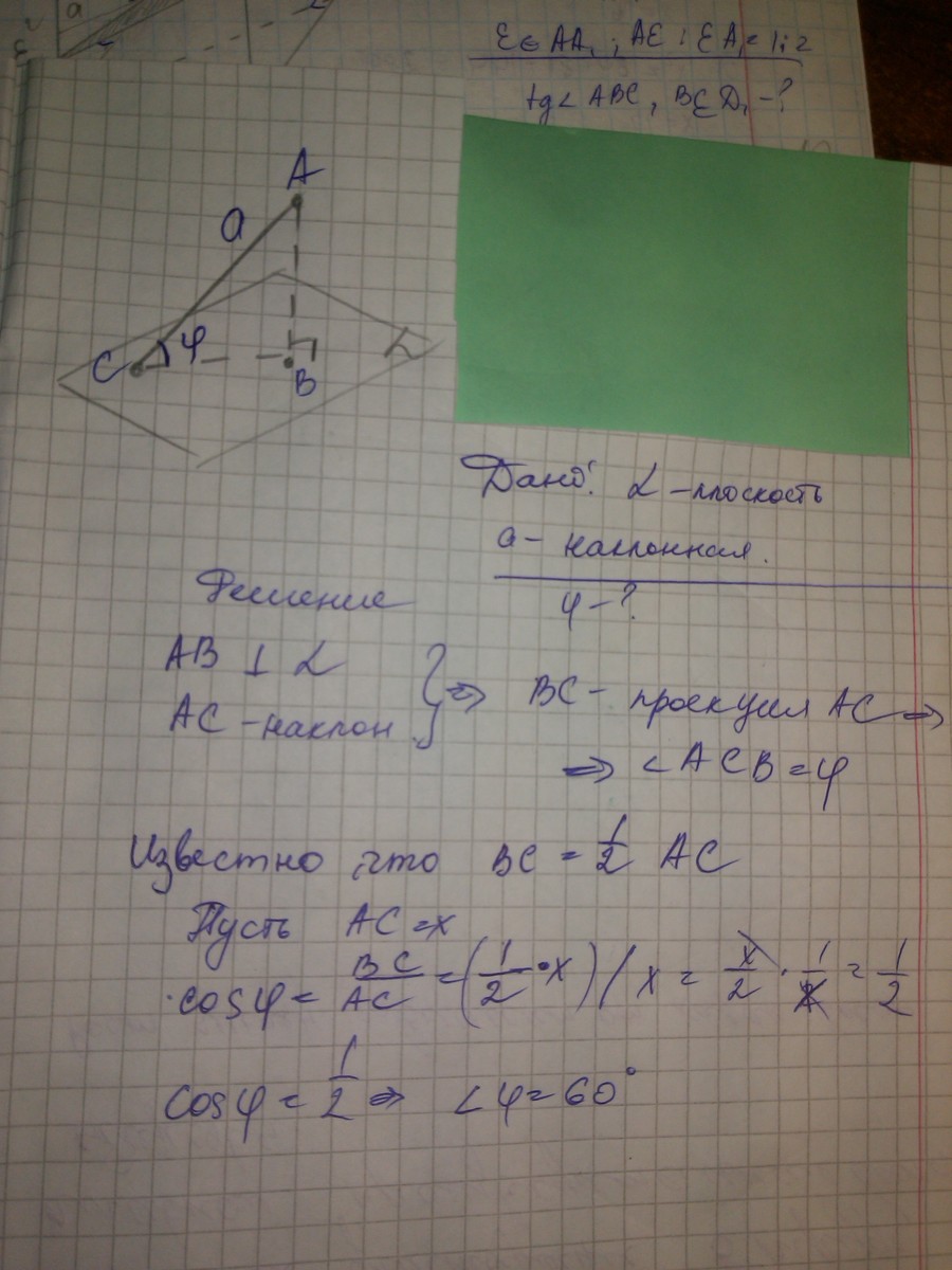 Под углом φ к плоскости α проведена наклонная. Найдите φ, если известно, что проекция наклонной вдвое меньше самой наклонной.