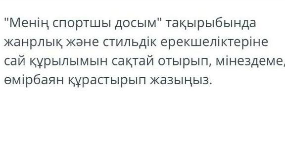 - Менің спортшы досым бар.Оның аты Бейбарыс.Ол 15 жаста.Мінезі өте қатал.Ол күреске катысады .Күресте оған ағайы мықты белестерге жету үшін күшті аямай жаттығу керек деп айтыпты .Менде ол секілді күреске барғым келеді.Көбінесе менің досым күреске таң ертең барады .Бірақ карантинге байланысты ол күрес секциясына бара алмай қалды.Ол егер карантин бітсе мен бірден күресті жалғастырамын дейді .Ал қазырще ол үйде дайындалып жүр