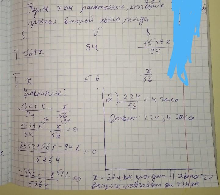 На расстоянии 224 км от города В второй первый автомобиль догонит второго