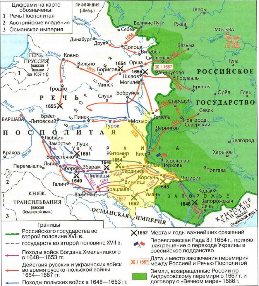 2) Покажите территорию возвращённую россии по Андрусовскому перемирию и договору о вечном мире. Назовите города, которые находятся на этой территории. 3) Найдите на карте все сражения, указанные в тексте параграфа.