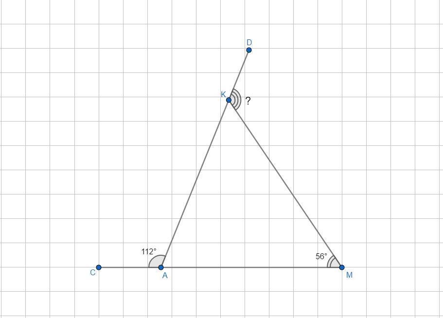 ∠CAK - внешний, тогда ∠CAK=∠AMK+∠AKM, откуда ∠AKM=∠CAK-∠AMK=112°-56°=56°.