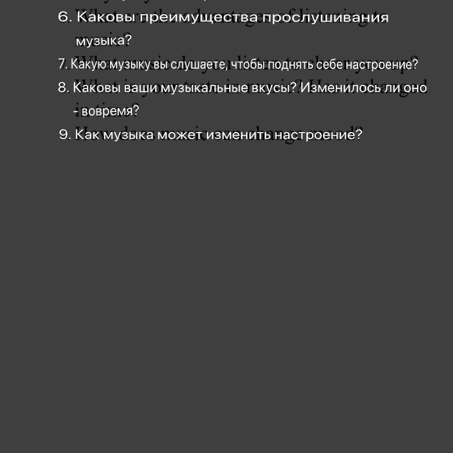 1) Когда слушаешь музыку, у тебя повышается настроение и всеселье, и хочется танцевать.... (хз что писать)