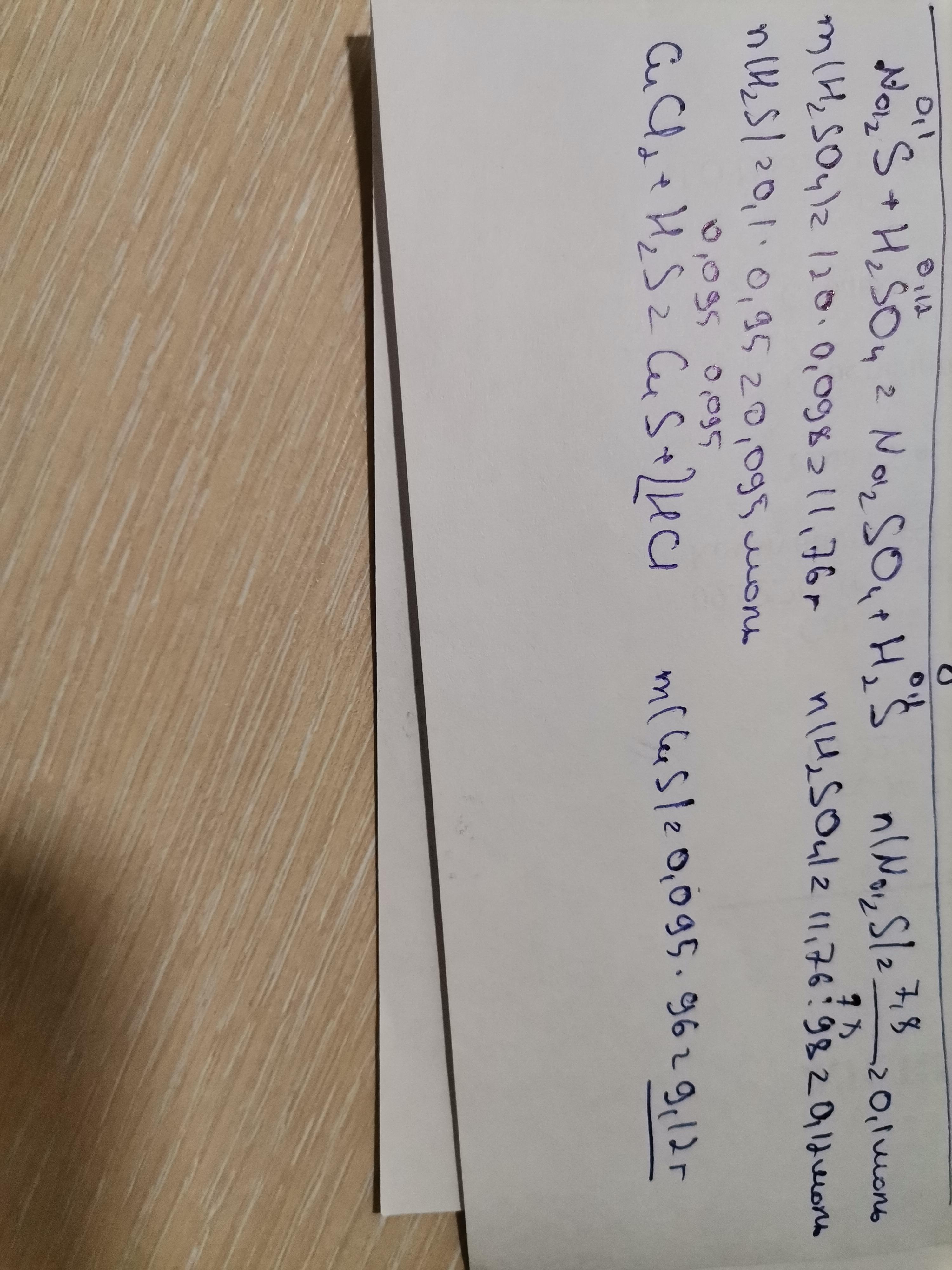 Сульфид натрия массой 7.8 г обработали р-ром H2SO4 массой 120 г c w=9.8%. Выделившийся Н2S (выход 95%) пропустили через избыток Cucl2. Найти массу осадка