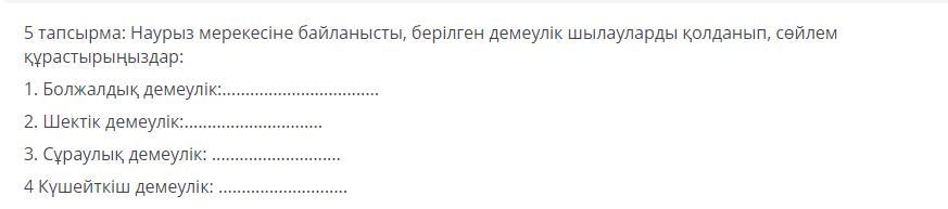 2. Қазақ халқы ғана Наурызды тойлайды ма десем, біраз халықтар атап өтеді екен. ( ғана )