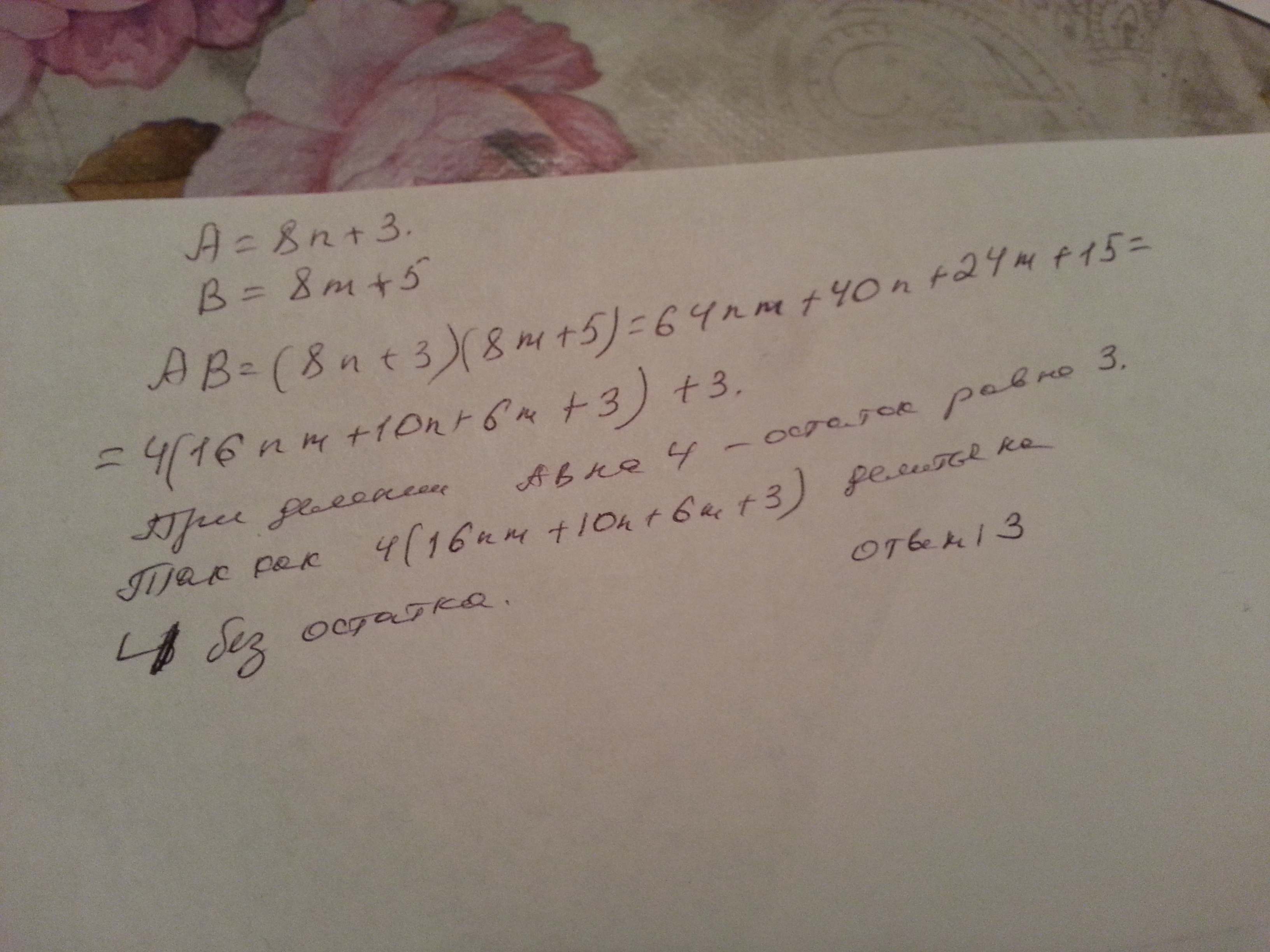 Число А при деление на 8 дает в остатке 3 ,а число В при делении на 8 дает в остатке 5 . Какой остаток получится при делении числа АВ на 4 ?