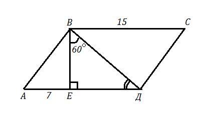 EBD600, AЕ = 7 см, BC = 15 см. Найдите площадь параллелограмма.