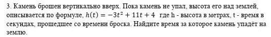 Камень брошен вертикально вверх. Пока камень не упал, высота, на которой он находится, описывается формулой h(t ) = -3t^2 +11t+4 , где h – высота в метрах, t – время в секундах, прошедшее с момента броска. Найдите время за которое камень упадёт на землю.