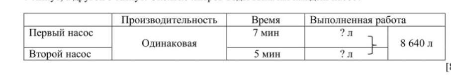Два одинаковых насоса выкачали из водохранилища 8640 л. воды. Один из них работал 7 минут, а