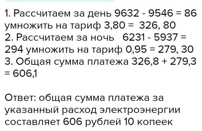 платёж за потребление электроэнергии осуществляется по двухтарифному счётчику. Тариф зависит от времени суток. Общая сумма платежа складывается из сумм по каждому из двух тарифов. Квитанция на оплату содержит следующую таблицу.
