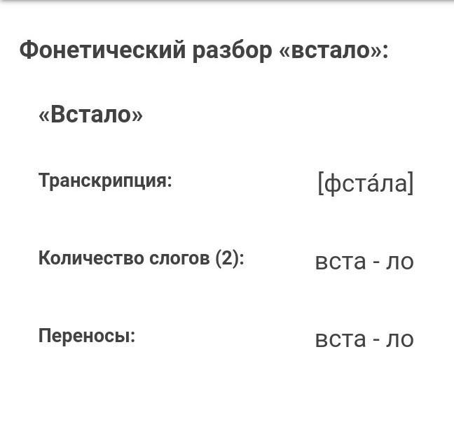 В слове «вста́ло»: слогов—2 (вста-ло), букв—6, звуков—6: