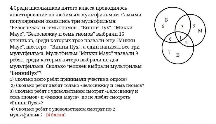 4.Среди школьников пятого класса проводилось анкетирование по любимым мультфильмам. Самыми популярными оказались три мультфильма: "Белоснежка и семь гномов", "Винни Пух", "Микки Маус". "Белоснежку и семь гномов" выбрали 16 учеников, среди которых трое назвали еще "Микки Маус", шестеро - "Винни Пух", а один написал все три мультфильма. Мультфильм "Микки Маус" назвали 9 ребят, среди которых пятеро выбрали по два мультфильма. Сколько человек выбрали мультфильм "ВинниПух"?