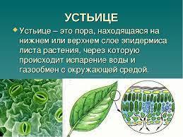 Устьице находится на нижнем или верхнем слое эпидермиса листа растения, через которую происходит испарение воды и газообмен с окружающей средой.
