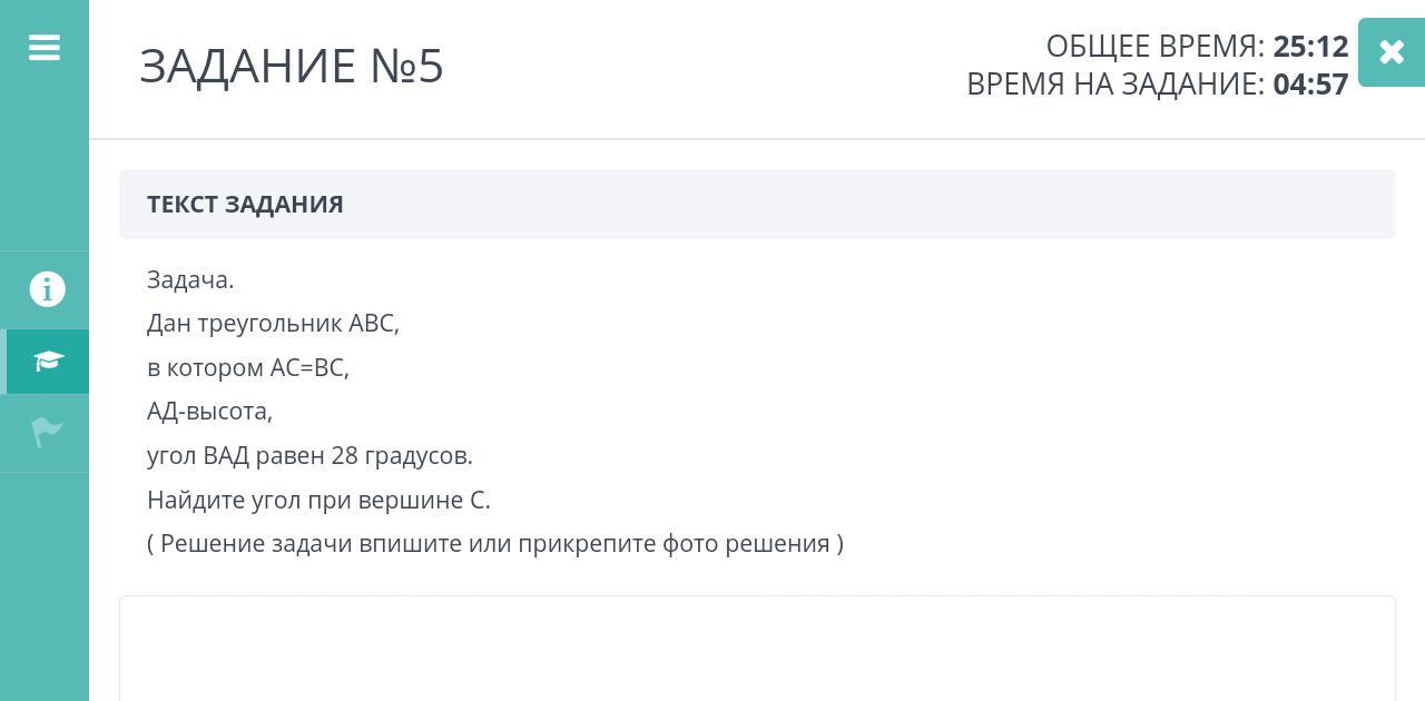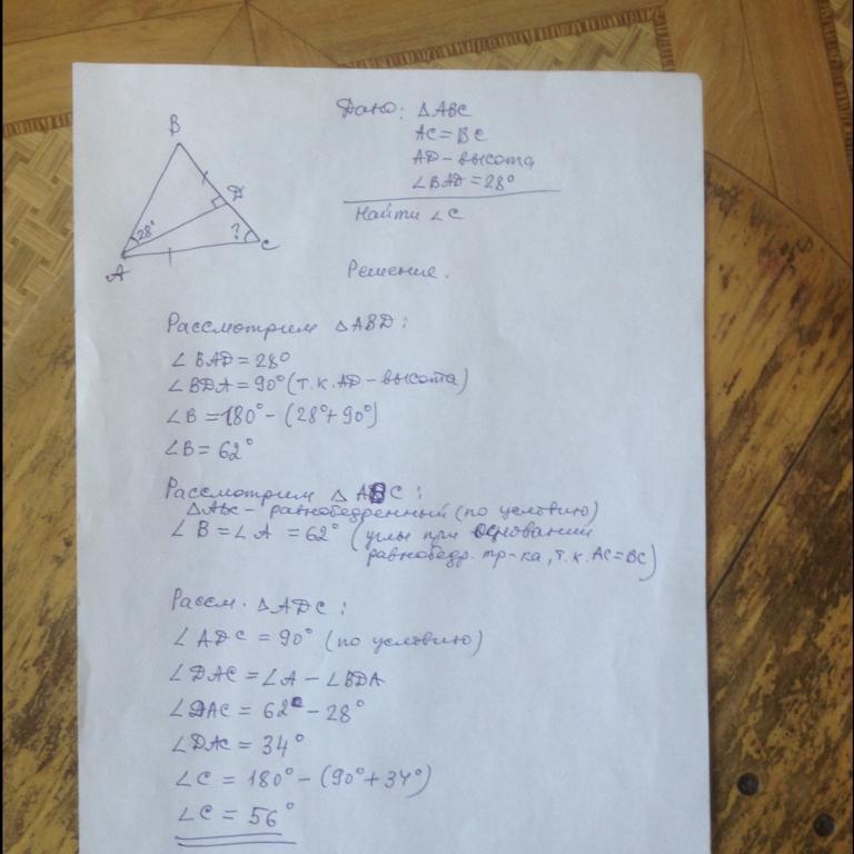 Дан треугольник ABC, в котором AC=BC, AД - высота, угол BAД равен 28 градусов. Найдите угол при вершине C. (Решение задачи впишите или прекрепите фото решения)