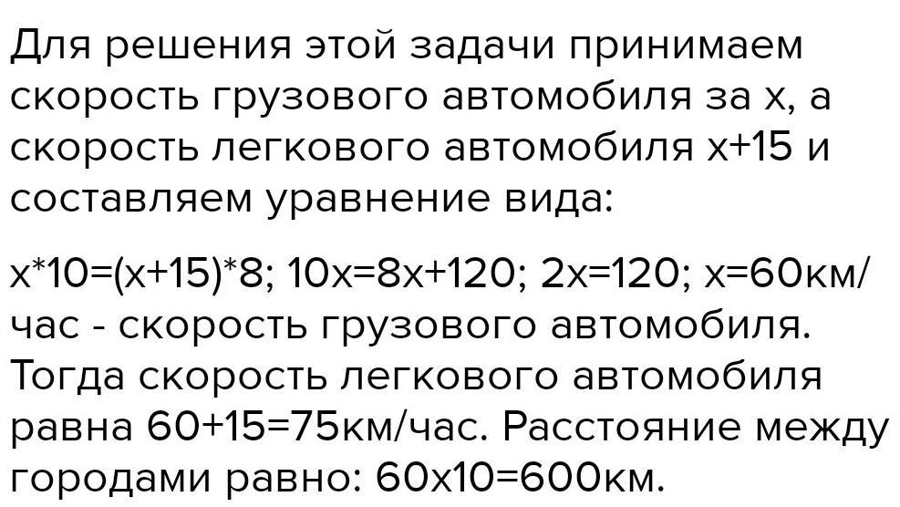 Из Павлодара до Кокшетау легковой автомобиль доезжает за 8 часов, а грузовая машина – за 10 часов. Найдите расстояние между Павлодаром и Кокшетау, если скорость легкового автомобиля на 15 км/ч больше скорости грузовой машины. [4]