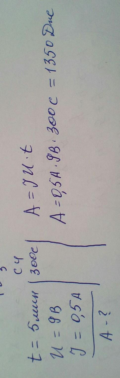 работу которую выполняет электрический ток за 5 минут работы электродвигателя детской игрушки при напряжении 9 в силе тока А 0,5 а равно
