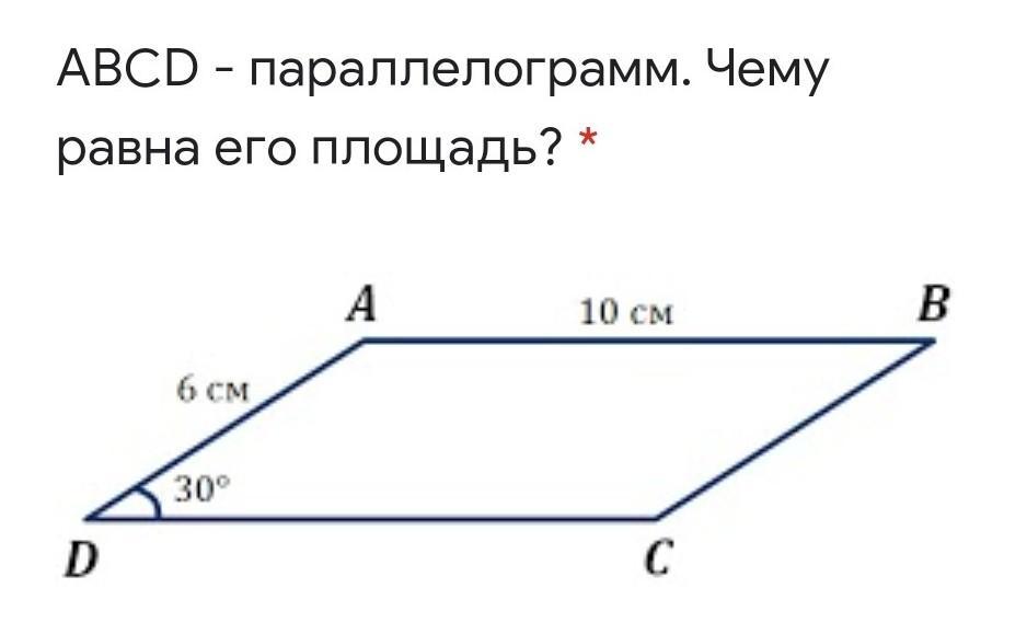 Площадь параллелограмма ABCD равна 25 см2. Чему равно расстояние от вершины B до прямой AD, если BC = 10 см? *