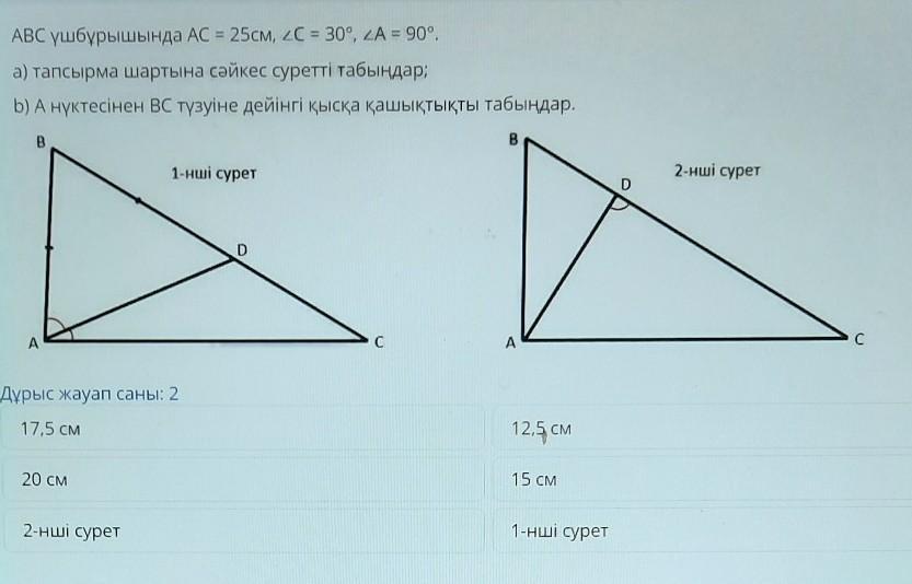 АВС үшбұрышында АС = 25см, 20 = 30°, А = 90°.