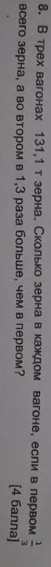 Дано: вагон₁ + вагон₂ + вагон₃ = 131,1 т зерна Вычисляем: вагон₁ = 131,1 х 1/3 = 43,7 т вагон₂ = 43,7 х 1,3 = 56,81 т вагон₃ = 131,1 - 43,7 - 56,81 = 30,59 т
