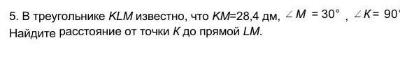 В треугольнике KLM известно, что KM=28,4 дм, М = 30° , К= 90° . Найдите расстояние от точки К до прямой LM.