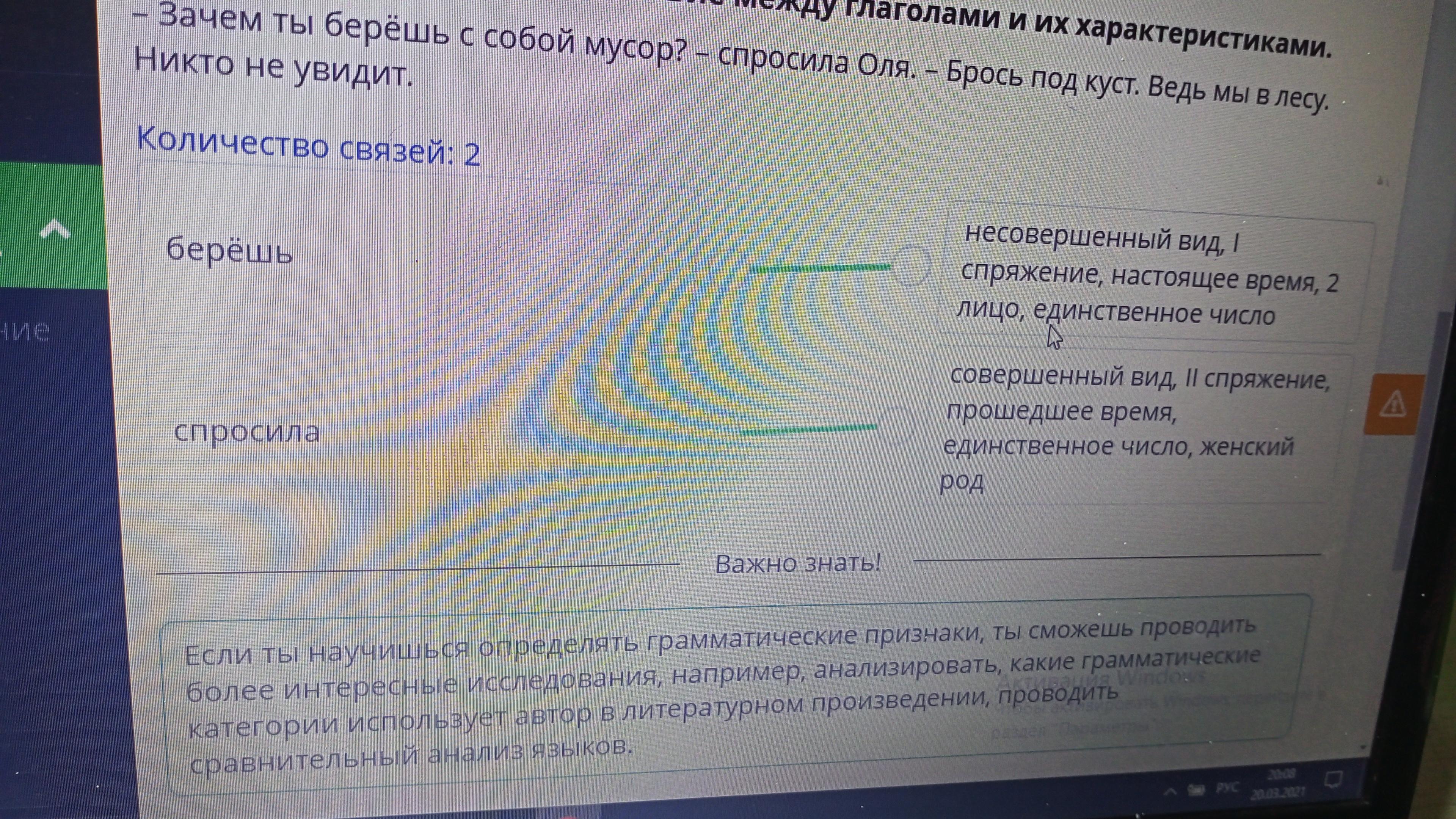Охранять природу – значит охранять Родину. Морфологический разбор глагола Прочитай. Установи соответствие между глаголами и их характеристиками. - Зачем тыты берёшь с собой мусор? - спросила Оля. — Брось под куст. Ведь мы в лесу. Никто не увидит. Количество связей: 2 несовершенн ый вид, спряжение, настоящее время, 2 лицо, единственное Число совершенный вид, II спряжение, прошедшее время, единственное число, женский род берёшь спросила A
