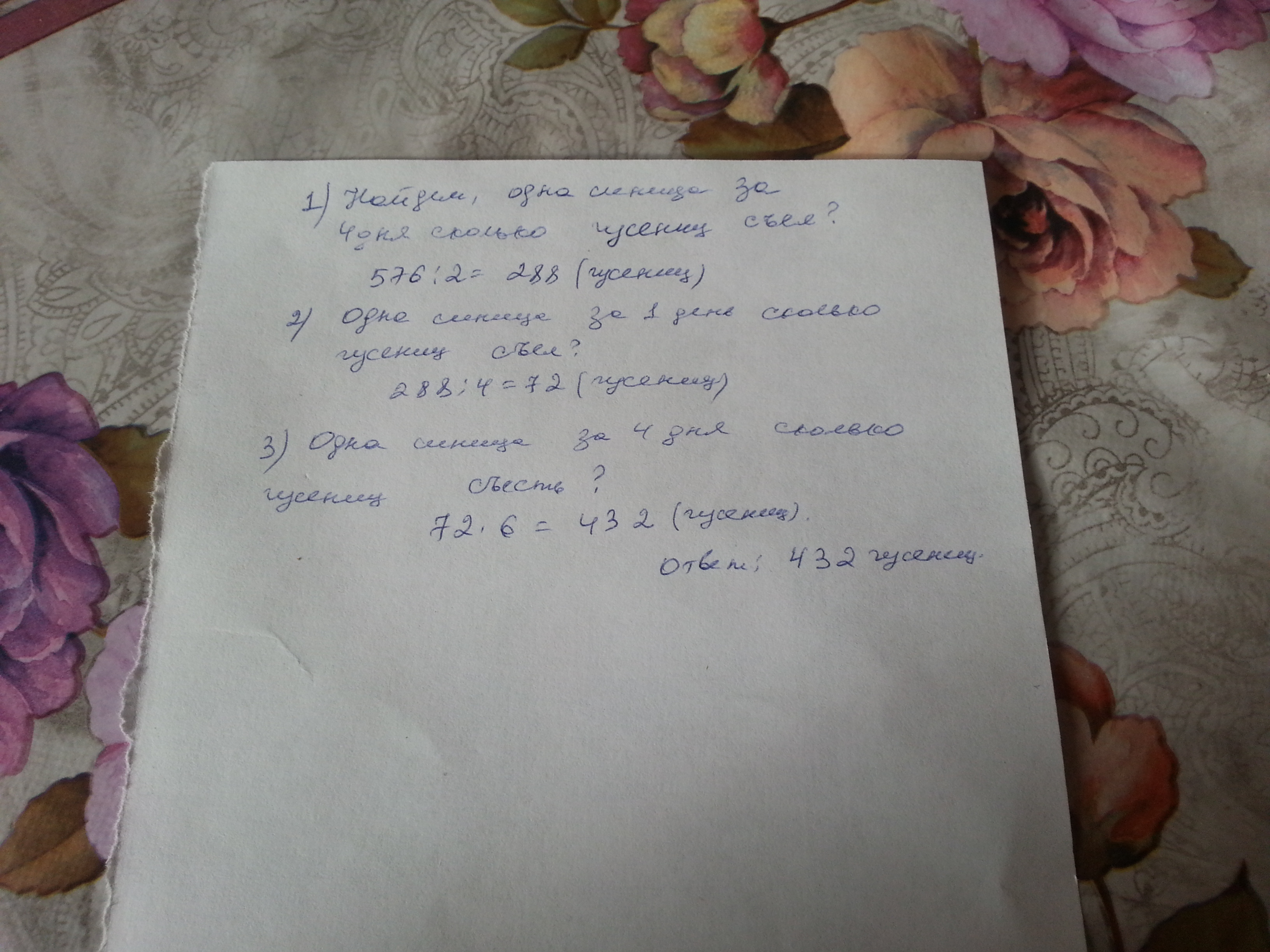 Дві синиці за 4 дні з"їли 576 гусениць,порівну кожна.Скільки гусениць з"їсть одна синиця за 6 днів?