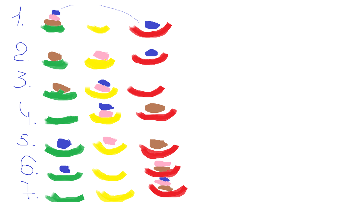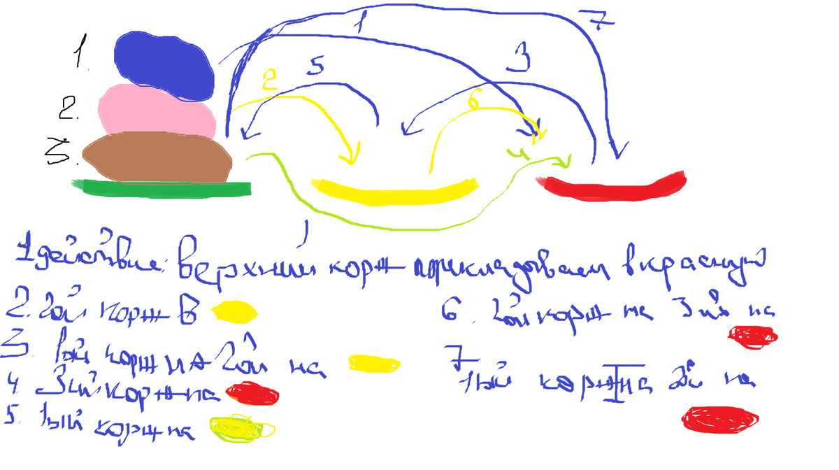Кулинар приготовил торт из трех коржей и положил его на зеленый поднос. Но оказалось, что посуда на столе красного цвета. Помогите кулинару переложить все коржи на красный поднос, используя желтый поднос как вспомогательный. За один ход можно переложить только один корж, и маленький корж нельзя положить на большой.