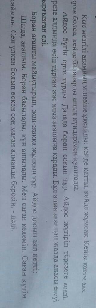 Ответ:қыс мезгілі адамның мінезіне ұқсайды кейде катты аяз болса кейде шуақты күндерімен балаларды қуантып қояды. Айдос бүгін ерте тұрып терезеге қарады.далада боран соғып тұр, Айдостың көзі бірден анасы екеуі отырғызған ағашқа түсіп кетті .жел ағашты оңды солды шайқап тұр екен.Айдос ағашты қатты аяп кетты. Ағашқа боранның басылатынын айтып ,демеуін көрсетті .Әлі ақ жел басылады ,сен жайқалып өсіп әлі-ақ маған жемістеріңді беретін боласың деді