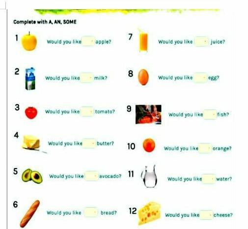 1. An 2. some 3. a 4. a 5. a 6. a 7. some 8. an 9. a 10. an 11. some 12. a