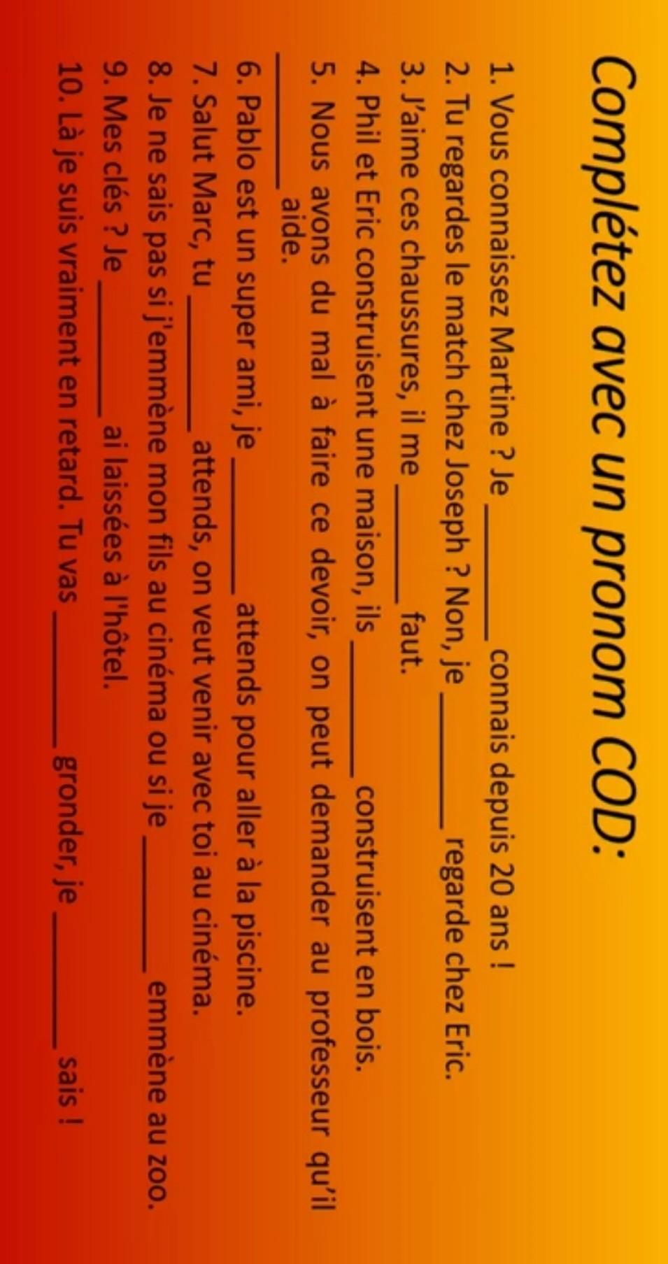 1. la 2.le 3. vais 4. la 5. nous 6. l' 7. je suis ton ami 8. l' 9. l'ai 10. vraiment 10. le