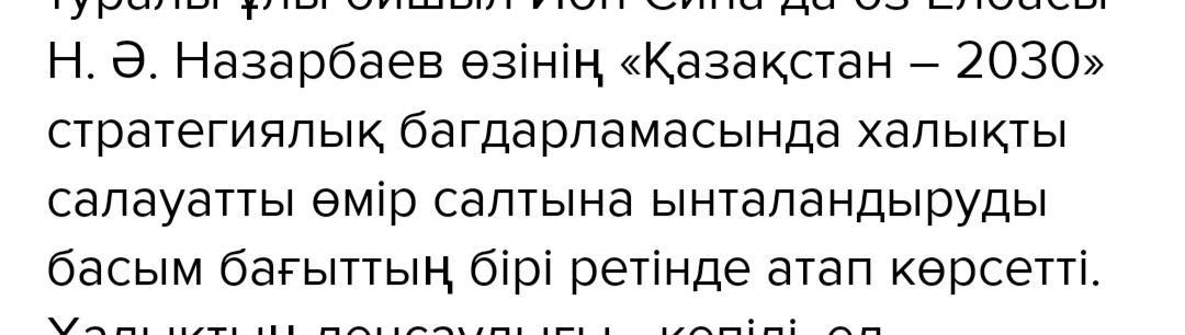 «Қазақ тілі мен әдебиеті» пәнінен 3-тоқсан бойынша жиынтық бағалау тапсырмалары Тыңдалым Мәтінді мұқият тыңдап, төмендегі тапсырмаларды орындаңыз. Спорт - денсаулық кепілі Спорттың адам өмірінде алатын орны зор екендігін бәріміз білеміз. Спортпен айналыскан адамның денсаулығы мықты, өзі шыдамды болады. Біздің ата бабаларымыз «Тені саудың – жаны сау» деп бекер айтпаган. Спорттын кай турімен айналысу адамның қабілетіне байланысты шыгармаларында айтқан. Ол сондай-ақ спортты мағынасына қарай жеңіл, ауыр, ұзын, қысқа деп бірнеше турге белген. Денсаулық пен өмірді дамыту үшін кем дегенде спорттың 33 турінен жаттығу жасау керектігін айтқан. болады. Бұл туралы ұлы ойшыл Ибн Сина да өз Елбасы Н. Ә. Назарбаев өзінің «Қазақстан – 2030» стратегиялық багдарламасында халықты салауатты өмір салтына ынталандыруды басым бағыттың бірі ретінде атап көрсетті. Халықтың денсаулығы - кепілі. ел дамуының аса маңызды тұтқасы, болашағымыздың «Бірінші байлық - денсаулық» немесе «Денсаулық - терең байлық» деген даналық метелдері тіршіліктің нағыз өзегінен алынған емес пе? Тағы да «Ауырып ем іздегенше, ауырмайтын жол ізде» деп, жан мен тән саулығын қоршаған ортада дұрыс сақтап және нығайтуға түрлі пайдалы әрекеттер жасап отырган. 1. Денсаулық пен өмірді дамыту үшін кем дегенде спорттың қанша түрінен жаттығу жасау керек? А) 35 2. В) 33 C) 31 Д) 32 Мәтін мазмұнына сай берілген дұрыс ақпараттарды ажыратыңыз. Ақпараттар Спорттың қандай турімен айналысу адамның p/c A B/C дүрыс қабілетіне байланысты. Н. Назарбаев спортты бірнеше түрге бөлген. Денсаулық - ел дамуының аса маңызды туткасы, болашағымыздың кепілі. 3. Спортпен айналысудың денсаулыққа пайдасы бар ма? 4. «Қазақстан - 2030» бағдарламасындағы негізгі бағыттардың бірі қандай? бүрыс