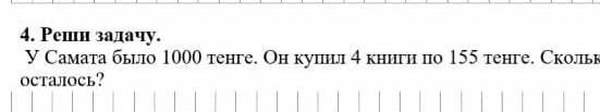 РЕШИ ЗАДАЧУ С КРАТКАЙ ЗАПЕСЬЮ! у Самата было 1000тенге он купил 4 книги по 155 тенге сколько денег у него осталось