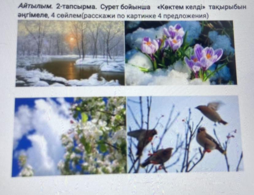 Көктем келгенде дала жылы болады. Құстар қысқы ұйқыларынан оянып ағаштарға қонып өз өлендерін айта бастайды. Қарлар ериді. Гүлдер ашылып жайнап жүреді. Ағаштарда әдемігүлдер шығарады. Маған көктем мезгіліқатты ұнайды.