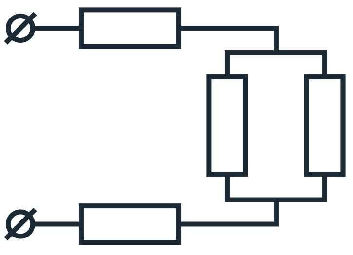 На рисунке изображено соединение четырех одинаковых сопротивлений, каждое из которых равно 4 Ом. Напряжение на клеммах равно 12 В. Определите общее сопротивление и силу тока через каждый резистор.