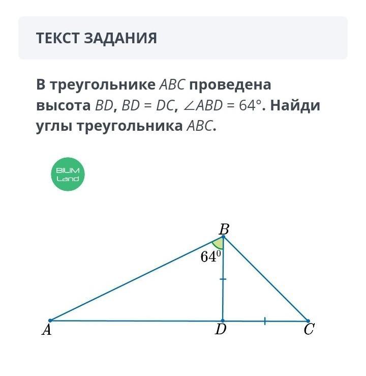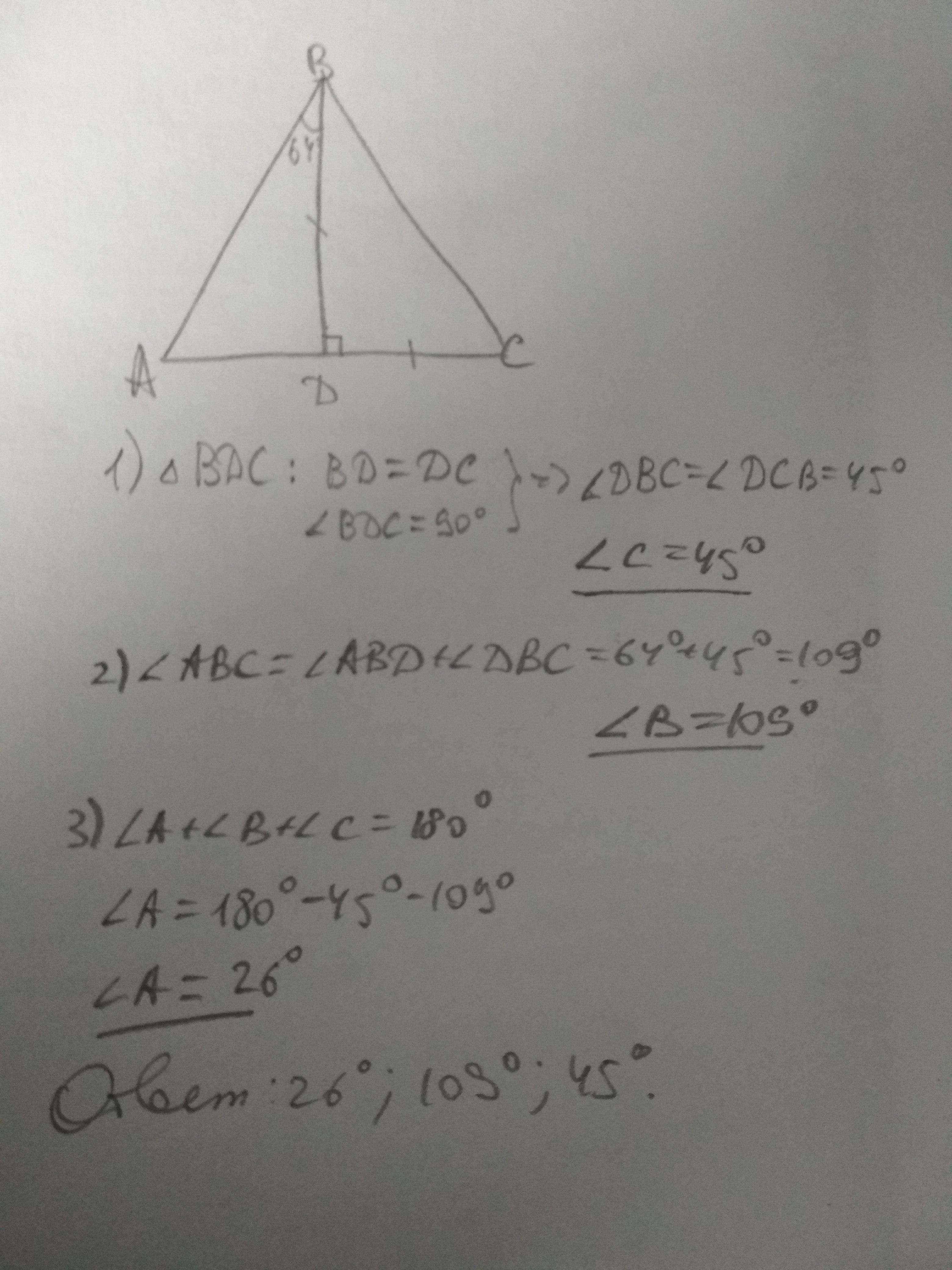 СРОЧНО.В треугольнике ABC проведена высота BD, BD = DC, ∠ABD = 64°. Найди углы треугольника ABC. 50 баллов.