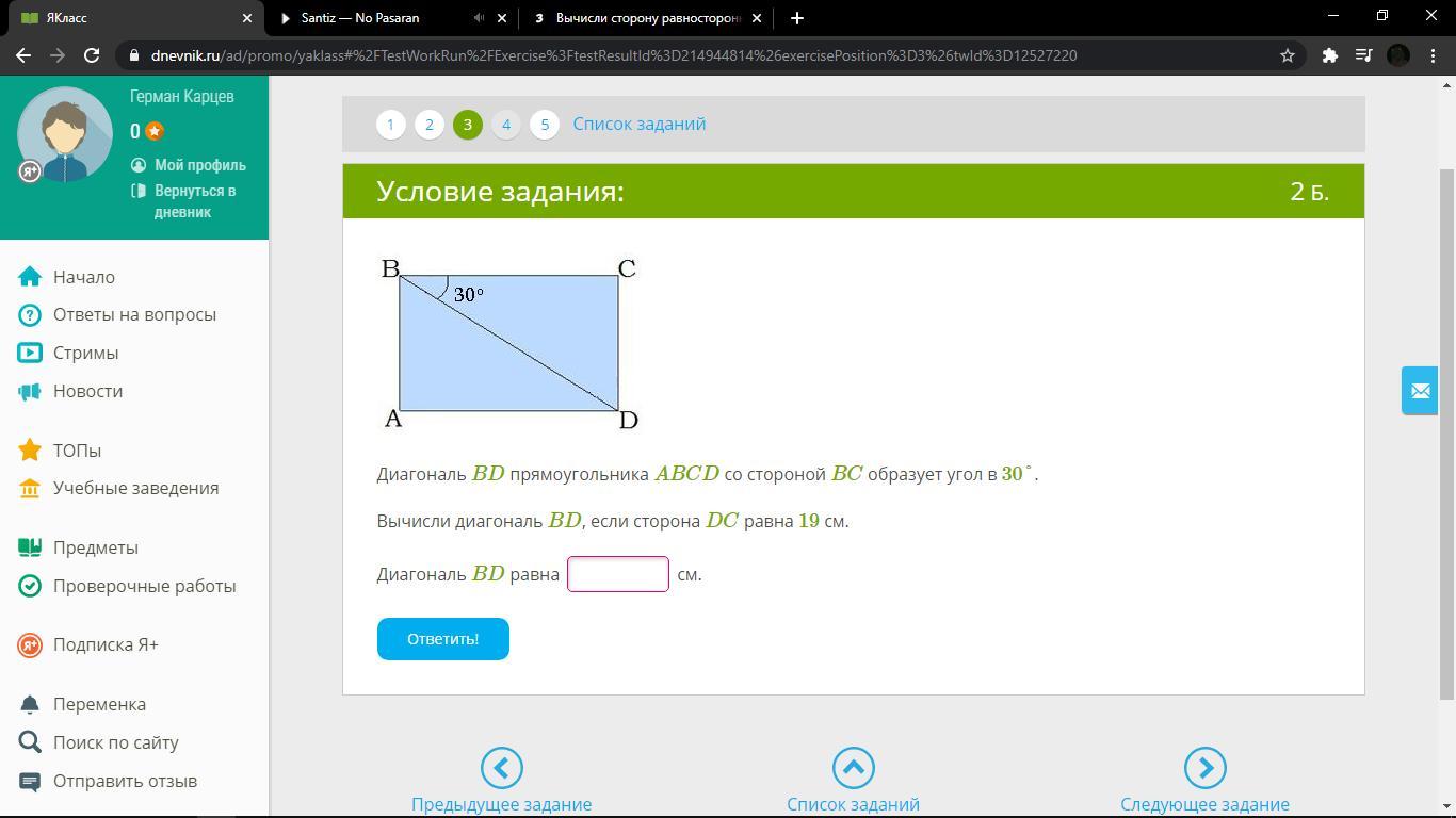 Диагональ BD прямоугольника ABCD со стороной BC образует угол в 30°.