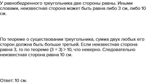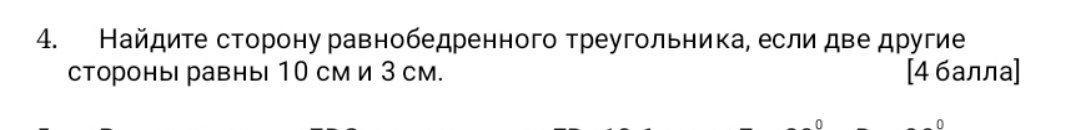 Найдите сторону равнобедренного треугольника, если две другие стороны равны 10 см и 3 см