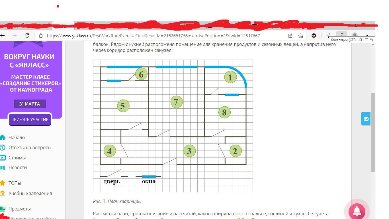 Рассчитай, какова ширина окон в спальне, гостиной и кухне, без учёта балконов.