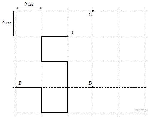 Лист бумаги расчерчен на квадраты со стороной 9 см. От точки А к точке В проведена ломаная по сторонам квадратов.