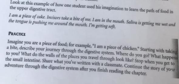 I am a piece of chicken. Incisors take bite of me and other teath start to chew. Now I'm cut into small pieces and wet because of the saliva. They swallow me and now I'm in esophagus (пищевод). Through it I get to stomach (желудок). Here I meet enzymes (ферменты) which begin to digest me. After some time of such impact I'm becoming soft. And now it's time to move to the small intestine, where my journey continues. In the end of it I'll be digested. The human body will receive useful substances (полезные вещества) and get red of remaining alimentary.