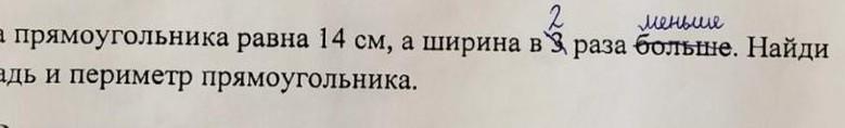 длина прямоугольника равна 14 см, а ширина в 2 раза меньше. Найди площадь и периметр