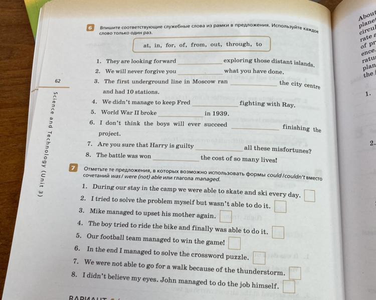 Впишите соотвествующие служебные слова из рамки в предложения. Используйте каждое слово только один раз.