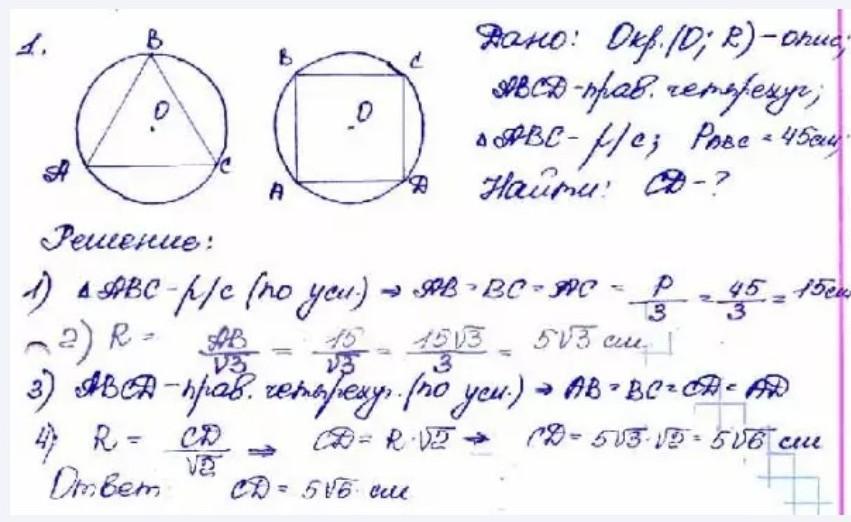 Периметр правильного треугольника, вписанного в окружность, равен 45 см. Найдите периметр правильного четырёхугольника и шестиугольника,выписаны в ту же окружность