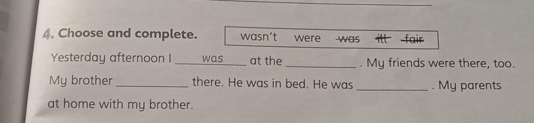 yesterday afternoon I was at the fair. My friends were there , too. My brother wasn't there. He was in bed. He was ill. My parents at home with my brother.