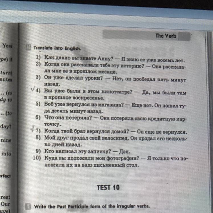 Ответ: 1) How long have you known Anna? 2) When did she tell you this story? -Ova story- I've known her for eight years. la me her last month. 3) Has he done his homework yet? No, he had lunch five minutes ago. V 4) Have you been to this cinema before? last Sunday. 5) Is Bob back from the store yet? - Not yet. He went there ten minutes ago. 6) What did she lose? - She lost her credit card - Yes, we were there point. 7) When did your brother come home? “He's not back yet. 8) A friend of mine sold his bike. He sold it a few days ago. 9) Who wrote this note? - Don. 10) Where did you put my photos? -I just put them on your desk. Я так поняла надо перевести