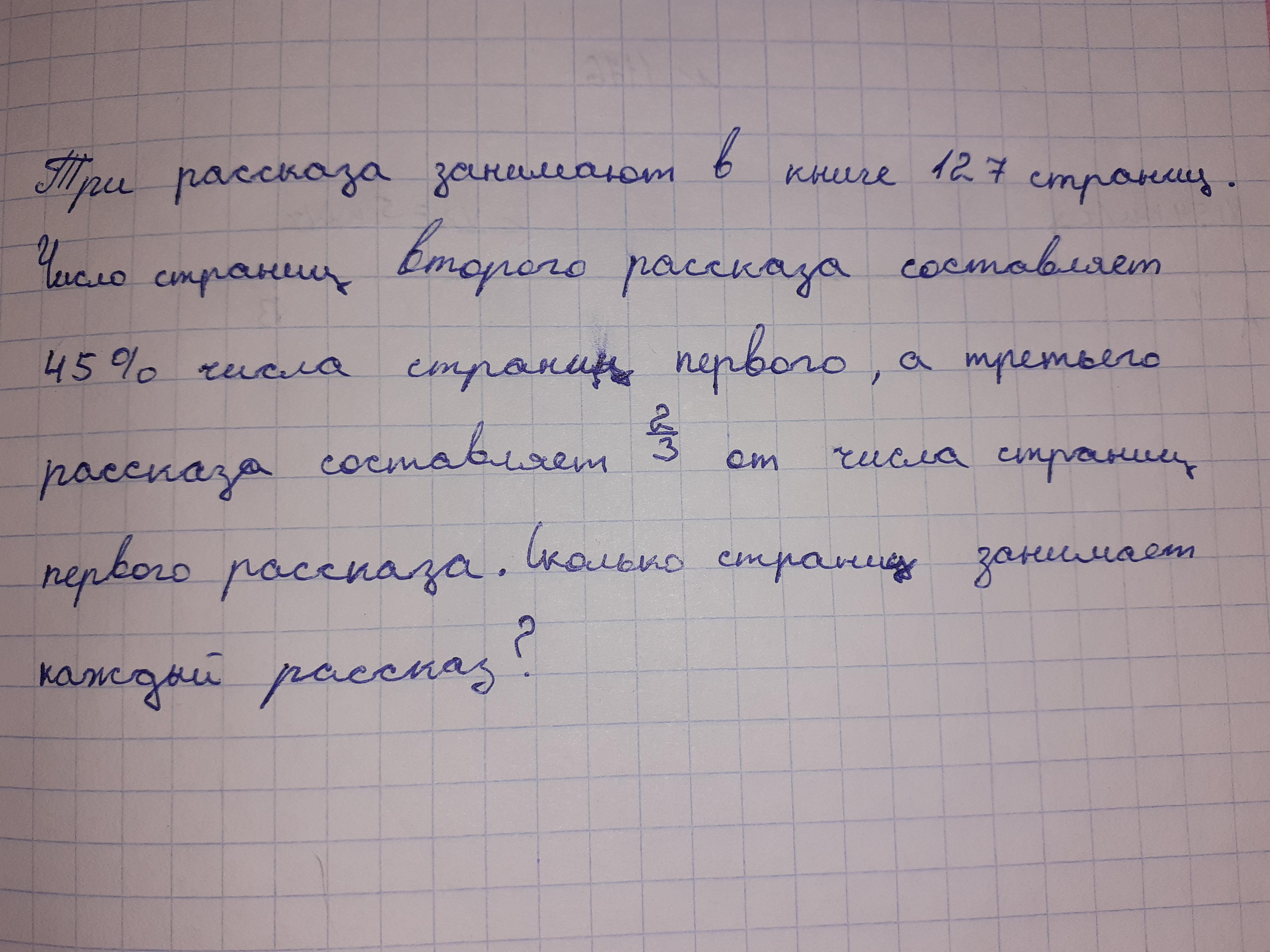 Пусть x - страницы в 1 рассказе, тогда 0,45x - страницы во 2 рассказе, 2x/3 - страницы в 3 рассказе