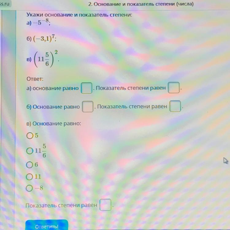 в) Основание: 11 5/6 Показатель степени: 2
