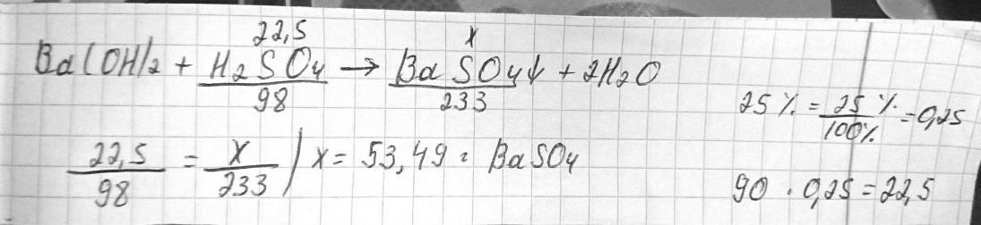 Определите массу осадка образующегося при действии гидроксида бария на 90 г 25 процентного раствора серной кислоты. Помогите пожалуйста срочно
