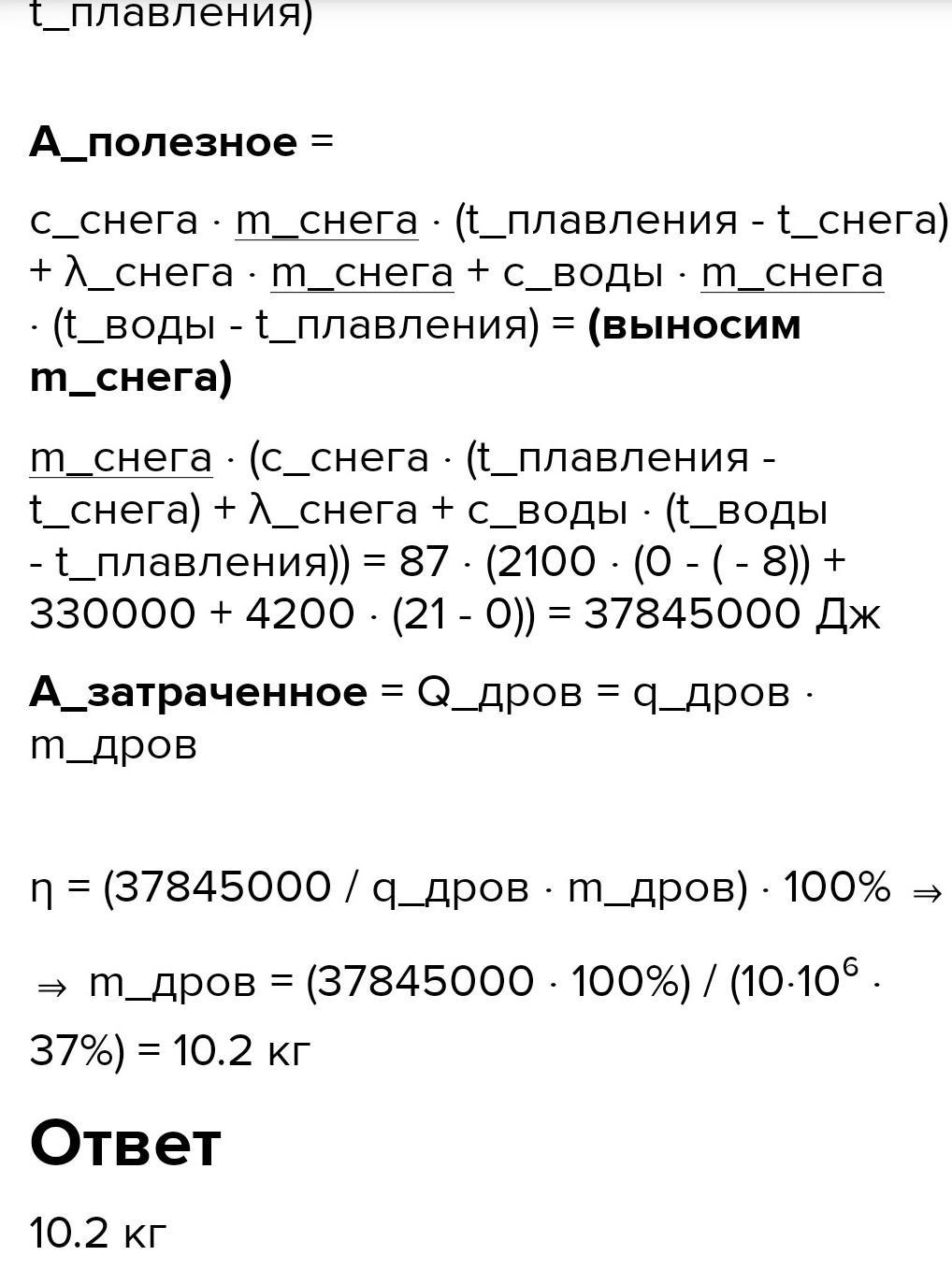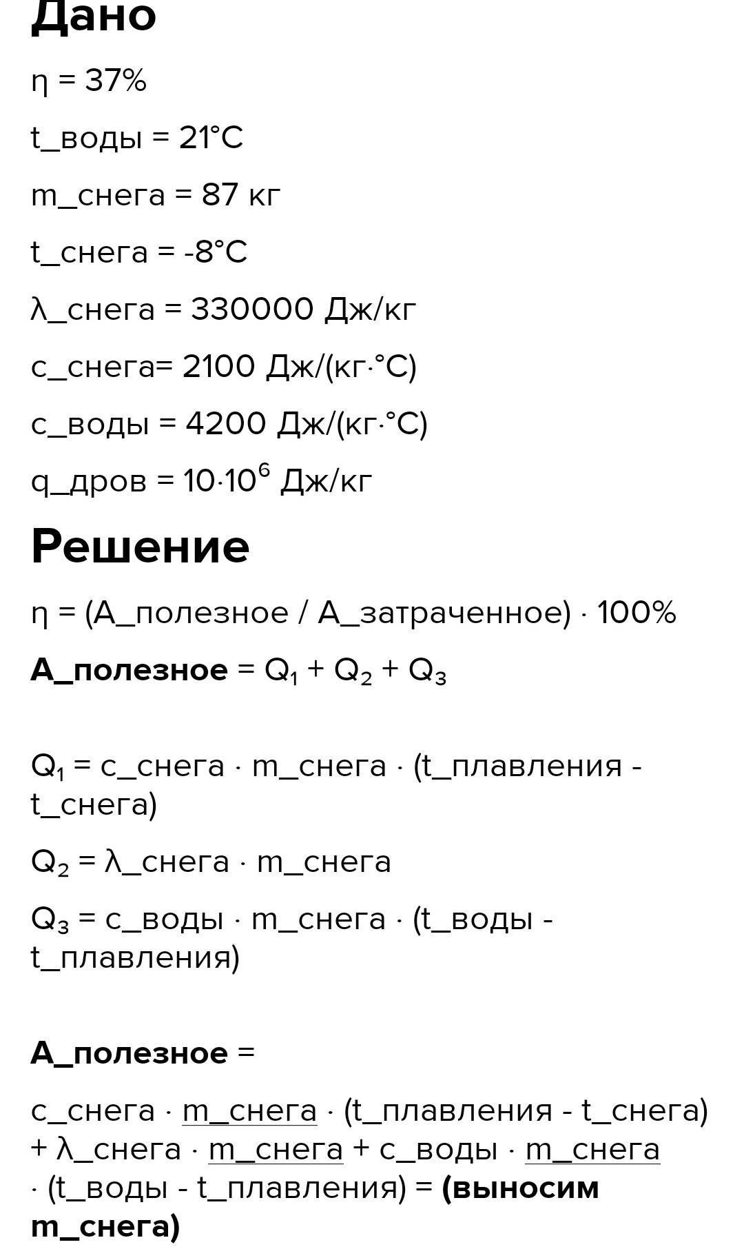 (Удельная теплота плавления снега λ=330000Джкг, удельная теплоёмкость снега с1=2100Джкг⋅°С, удельная теплоёмкость воды с2=4200Джкг⋅°С, удельная теплота сгорания дров q=10⋅106Джкг).