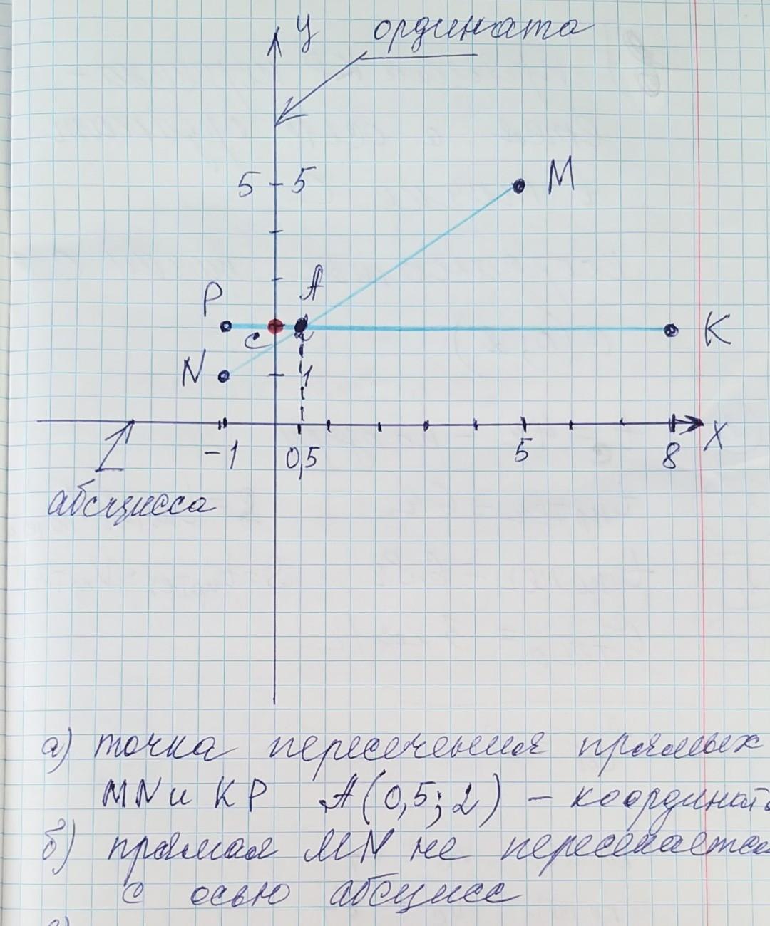 пересечение прямых MN и KP точка А(0,5; 2) КР пересекается с осью координат в точке С(0; 2)