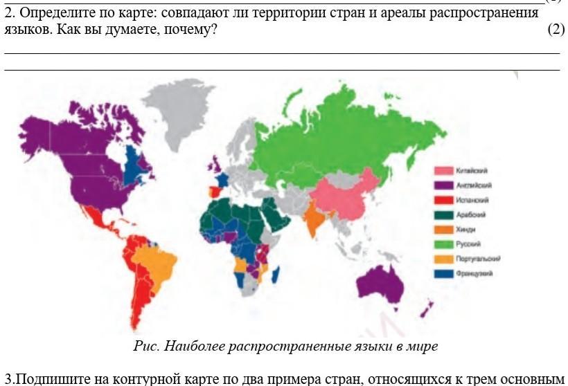 2. Определите по карте: совпадают ли территории стран и ареалы распространения языков. Как вы думаете, почему? (2)